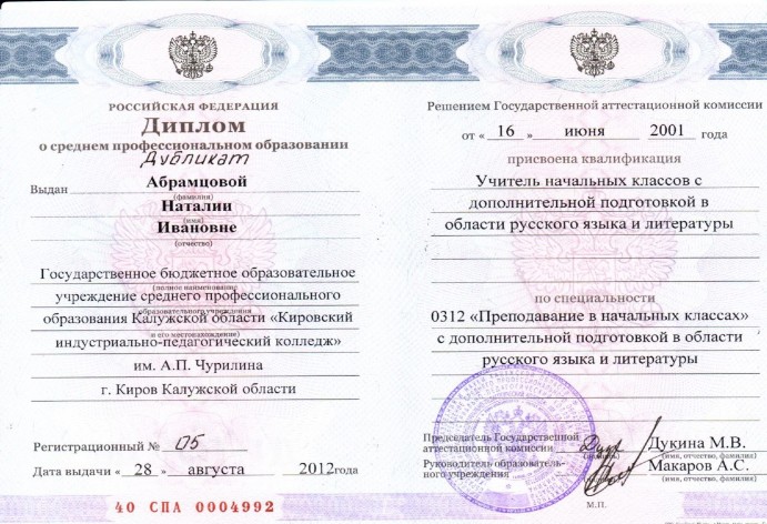 Диплом среднего профессионального педагогического образования